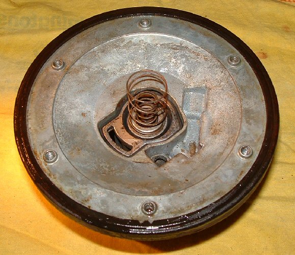 Place the rear piston half, rear face down, on the support that was used earlier. Assemble the diaphragm and