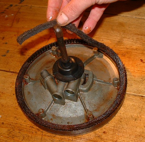 laying flat on the bench, remove the felt retaining ring by carefully springing it away from the grooves in the